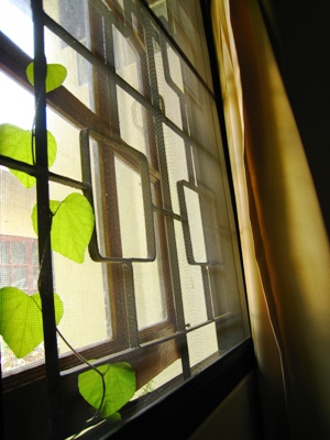 少し前の朝、その窓の格子に、くるんと緑の蔦が巻きついていた。
