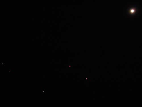 白く輝く月、赤く輝く星が、ひとつ、ふたつ、みっつ、よっつ、いつつ、むっつ、ななつ・・・浮遊してます。