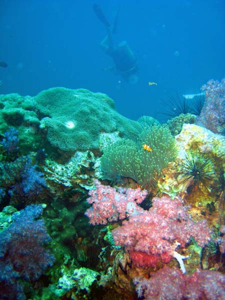 色とりどりのトゲトサカ。イソギンチャクとクマノミ。
